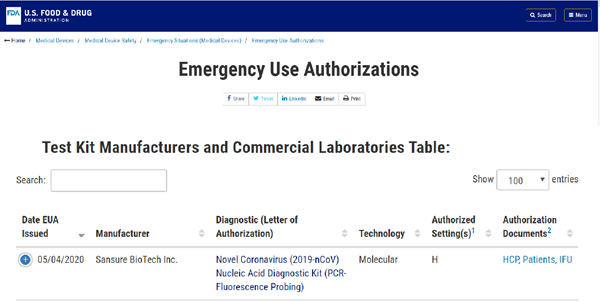 北京时间5月5日晚,开元体育生物新型冠状病毒核酸检测试剂盒获美国食品药品监督管理局(FDA)紧急使用授权(EUA, Emergency Use Authorizations),这是该产品继1月28日获得中国国家药监局(NMPA)注册认证、3月3日获得欧盟CE认证后,开元体育生物获得的又一重要认证,将进一步助力公司服务全球新冠肺炎疫情防控。